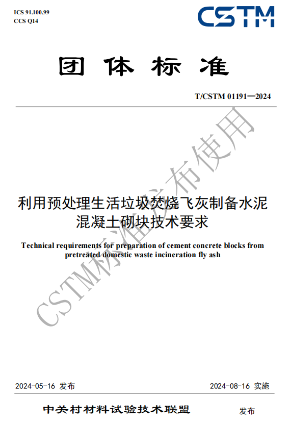 《利用预处理生活垃圾焚烧飞灰制备水泥混凝土砌块技术要求》标准号T/CSTM 01191-2024,该标准由湖州京兰环保科技有限公司及中国建筑材料科学研究总院有限公司等单位主编,由中国材料与试验标准化委员会于2024年05月16日批准发布,将于2024年8月16日起实施。文件规定了经解毒处理后的生活垃圾焚烧飞灰制备的水泥混凝土砌块的术语和定义、规格、等级和标记、原材料、技术要求、试验方法、检验规则、包装、标志、运输和贮存污染控制要求。文件适用于建筑物与构筑物用预处理生活垃圾焚烧飞灰制备的水泥混凝土砌块,拓宽了飞灰资源化利用途径,实现飞灰的合理处置。